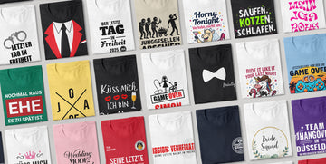 Bei uns gibt’s mehr als nur T-Shirts – wir liefern Statements! Mit einer riesigen Auswahl an Designs für Männer und Frauen, von frechen Sprüchen, bis hin zu individuellen Insiderwitzen, haben wir für jedes JGA-Motto das Richtige. Und wenn du etwas Einzigartiges willst? Schick uns einfach deine Designvorlage oder benutze unsere personalisierbaren Produkte, um diese mit eigenem Text und Motiven zu gestalten.